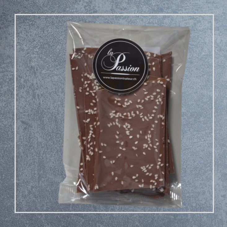 | Ingrédients | Sucre, beurre de cacao, poudre de lait entier, pâte de cacao, émulsifiant (lécithine de soja), extrait de vanille, sésame |